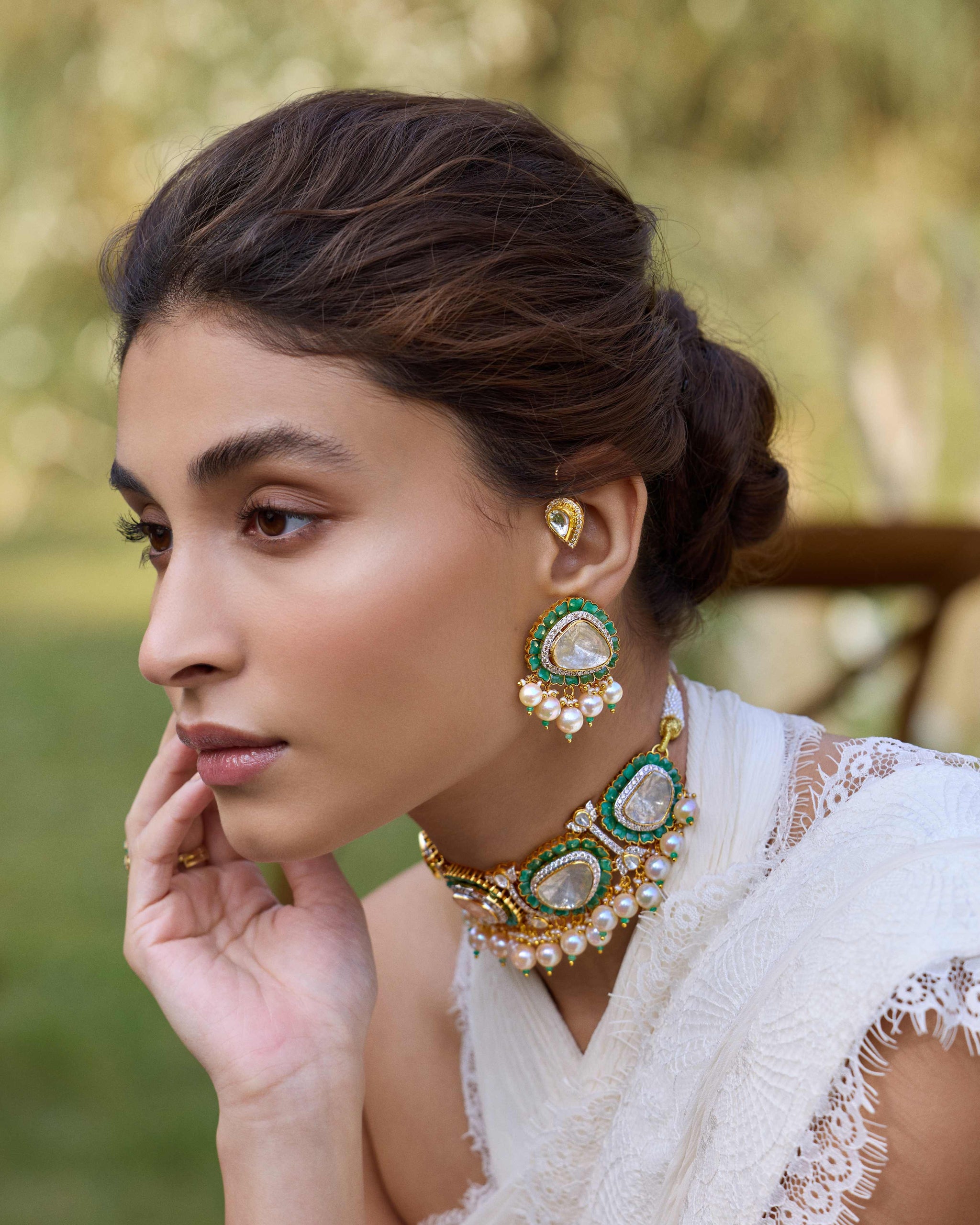 The Zoya Emerald Earrings cascade with over 50 carats of vibrant emeralds, delicate freshwater pearls, and a gleaming mix of round diamonds and syndicate polki—crafted to echo the grandeur of the choker they pair with. Style them with silk suits or Chanderi sarees—they were made for old-school elegance with a bold new twist.