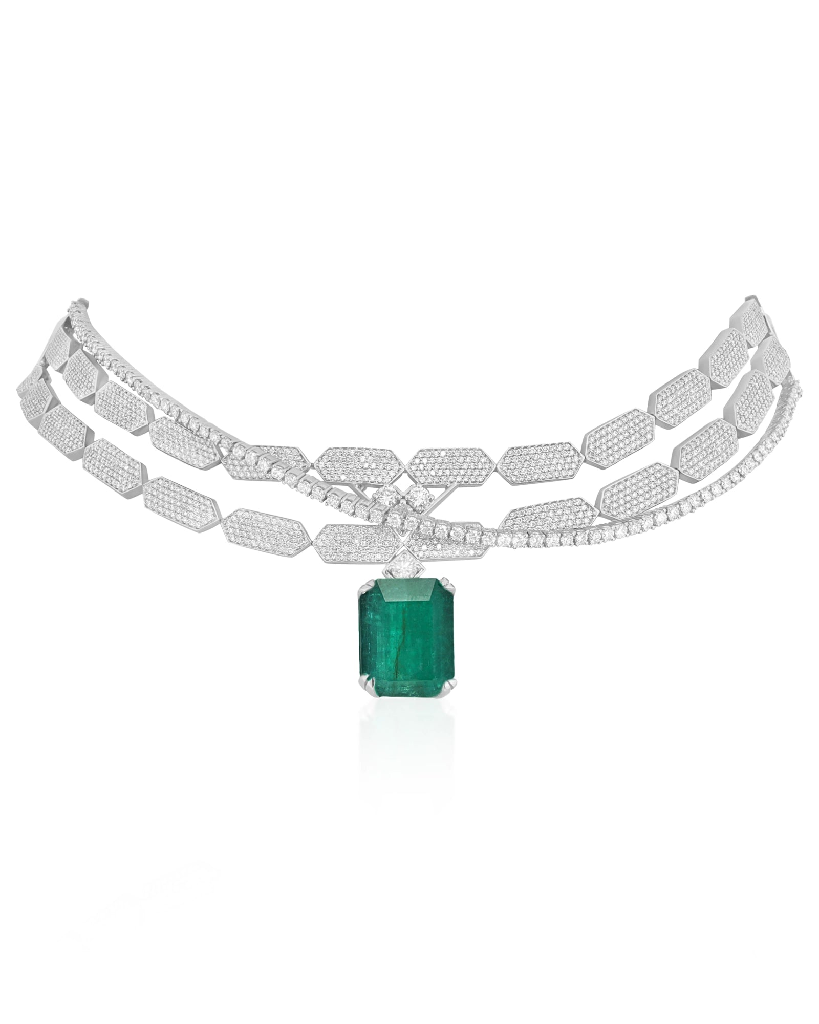 Introducing the Off Duty Choker 2.0 — a bold evolution of our beloved classic. This exquisite piece features two dazzling diamond strings, meticulously crafted in the House’s signature Flex motif, coming together to a breathtaking 23 carat emerald drop. Radiating with soft, feminine hues and a commanding presence, this choker is effortless. Whether you pair it with a slip dress or an oversized blazer, the Off Duty Choker 2.0 promises to elevate every look with its glamour.