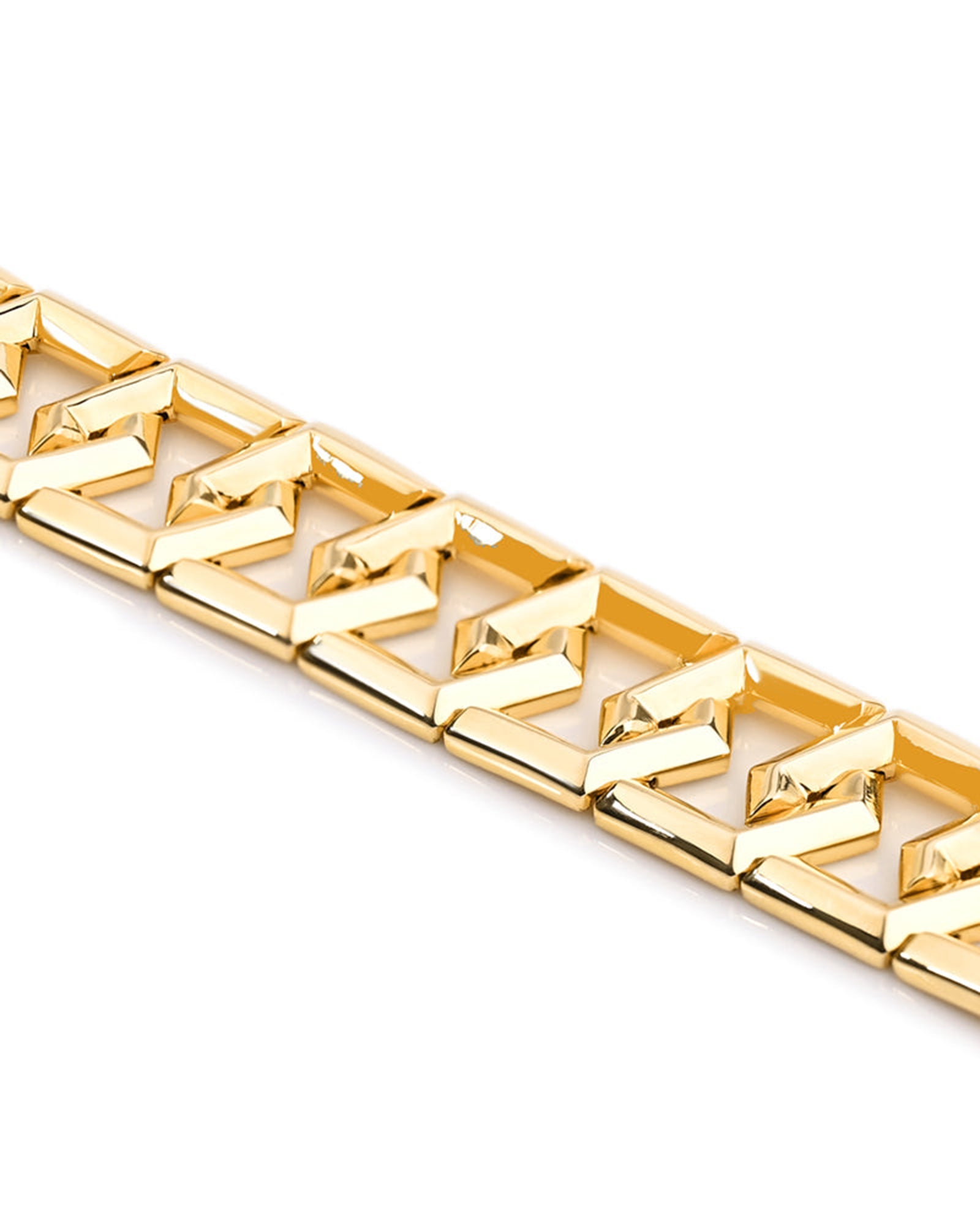 Bold, directional and instantly iconic, this molten gold choker is designed to pliantly encase your neck while dialing the glam way up. Featuring a series of intricately linked hexagons, handcrafted with over 52 gms of hallmarked 14k yellow gold, this bold silhouette is the ultimate showcase of AMARIS' signature riffs on classics aesthetic. This necklace adds infinite light and dimension to any look. Wear alone, or mix and match effortlessly with your favorite combination of layered necklaces to create a multi-tasking desk-to-dine look.