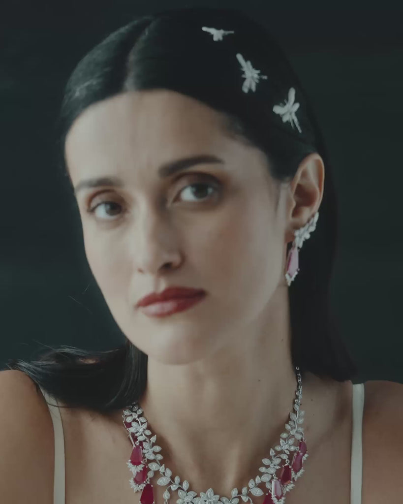 The Dragonfly Dreams set of four hairclips brings the magic of dragonflies to your hair, adding a playful yet luxe vibe to your look. Designed with sparkling diamonds, these clips are perfect for creating multiple hair moments—think cascading waves with a clip tucked on the side, an elegant bun adorned with all four, or a chic half-up style with a touch of shimmer. Lightweight yet dazzling, these clips effortlessly blend versatility with charm, letting you experiment and express your style, whether you’re walking down the aisle or dancing the night away.