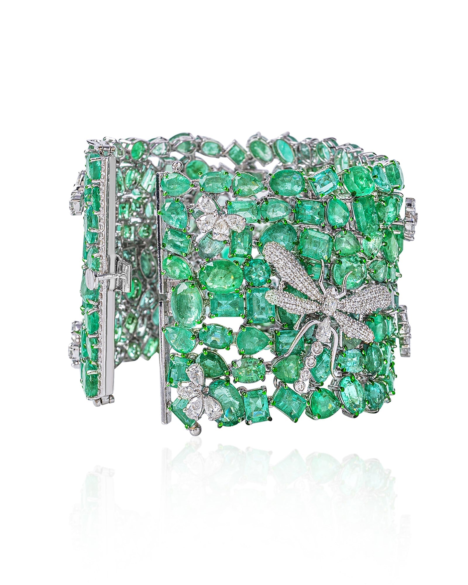 The Dragonfly Bracelet is a breathtaking symphony of nature’s allure and artistic craftsmanship. Showcasing an extraordinary 120 carats of rare, vivid emeralds, the bracelet forms a lush, verdant canvas that celebrates the vibrancy of life. Dancing across this emerald expanse are diamond-encrusted dragonflies, their wings shimmering with light and detail, creating a sense of graceful motion. Each dragonfly symbolizes transformation and freedom, bringing a poetic touch to this majestic design. A true masterpiece, the Dragonfly Bracelet is a bold yet enchanting statement for those who cherish unique creations inspired by the beauty of nature.