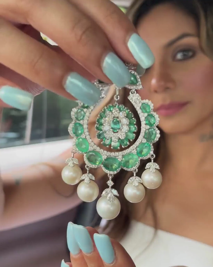 Zambian emeralds of striking depth, framed with over 13 carrats of marquee, pear, oval and round diamonds and finished with elegant pearl drops — the Mainstage Emerald Earrings embody heritage luxury at its finest. A statement piece for grand occasions, they carry the grace of tradition with the quiet confidence of legacy style. Pair this with black outfits and nude lips, and let these earrings make the grand entrance!