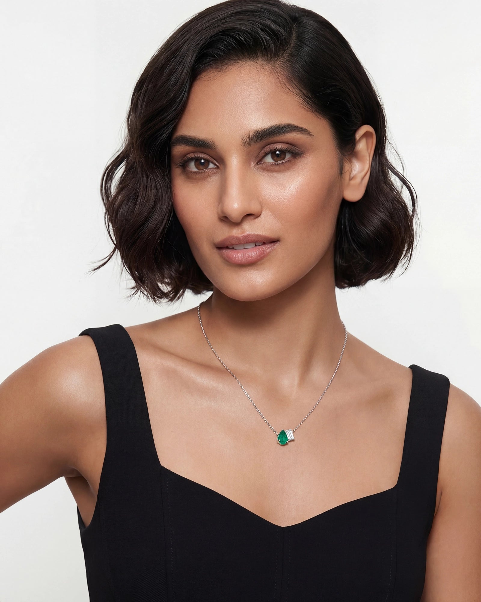 The Toi Et Moi Pendant is an everyday essential with a polished edge. Set with an emerald cut solitaire weighing 85 cents and offset with a pear shape Zambian emeralds, it adds a subtle hint of colour and sparkle to every outfit. Light, chic, and easy to style, it slips seamlessly into everyday looks—perfect worn solo or layered for a more OTT look.