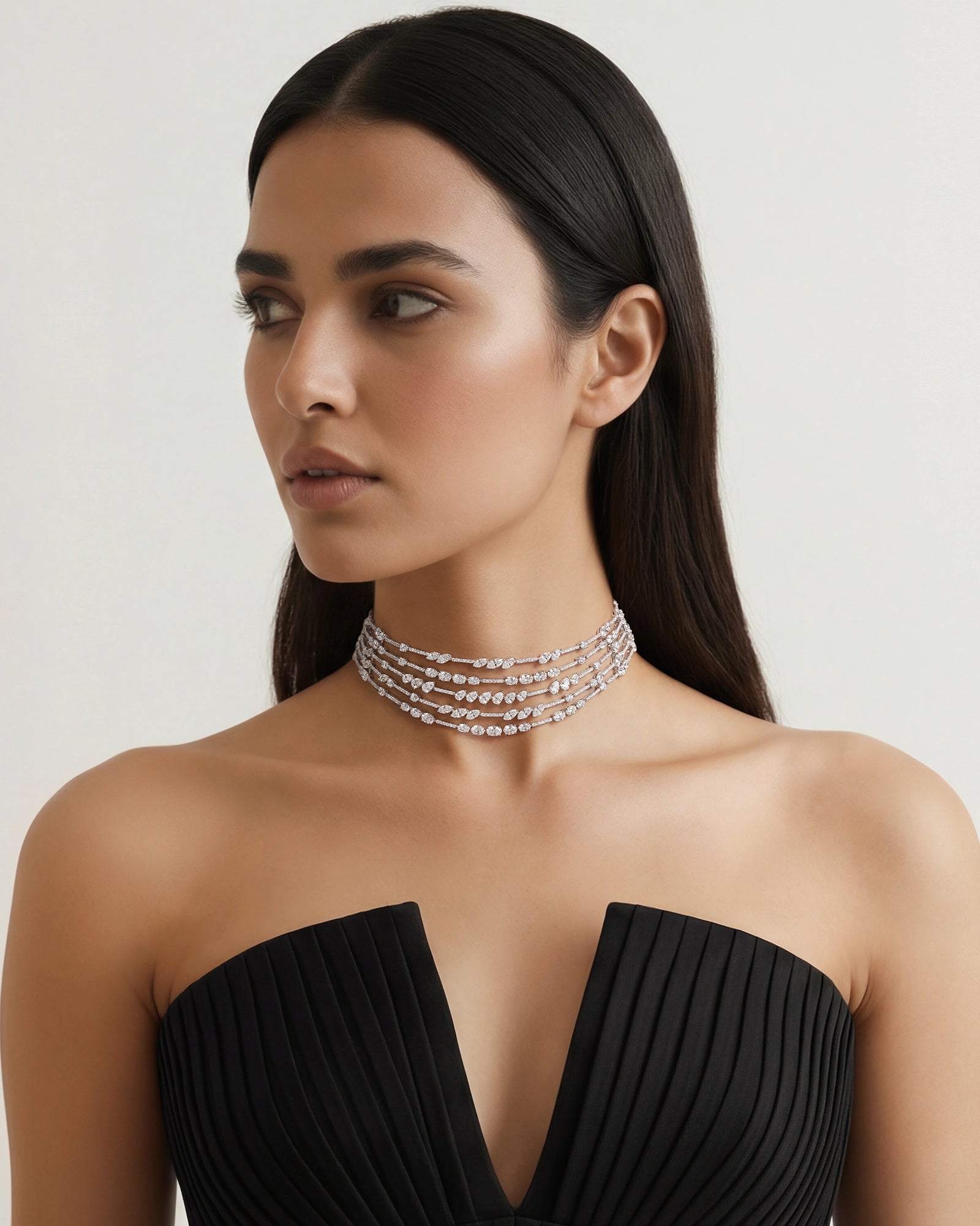 The Beeline Choker is all about sculpted precision. Its design weaves together rows of diamonds in alternating cuts — round, pear, marquise, and oval — each reflecting brilliance in its own distinct way. With over 26 carats of diamonds, the piece wraps close to the neckline, and travels with you from boardrooms to evening soirees.