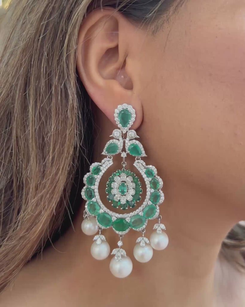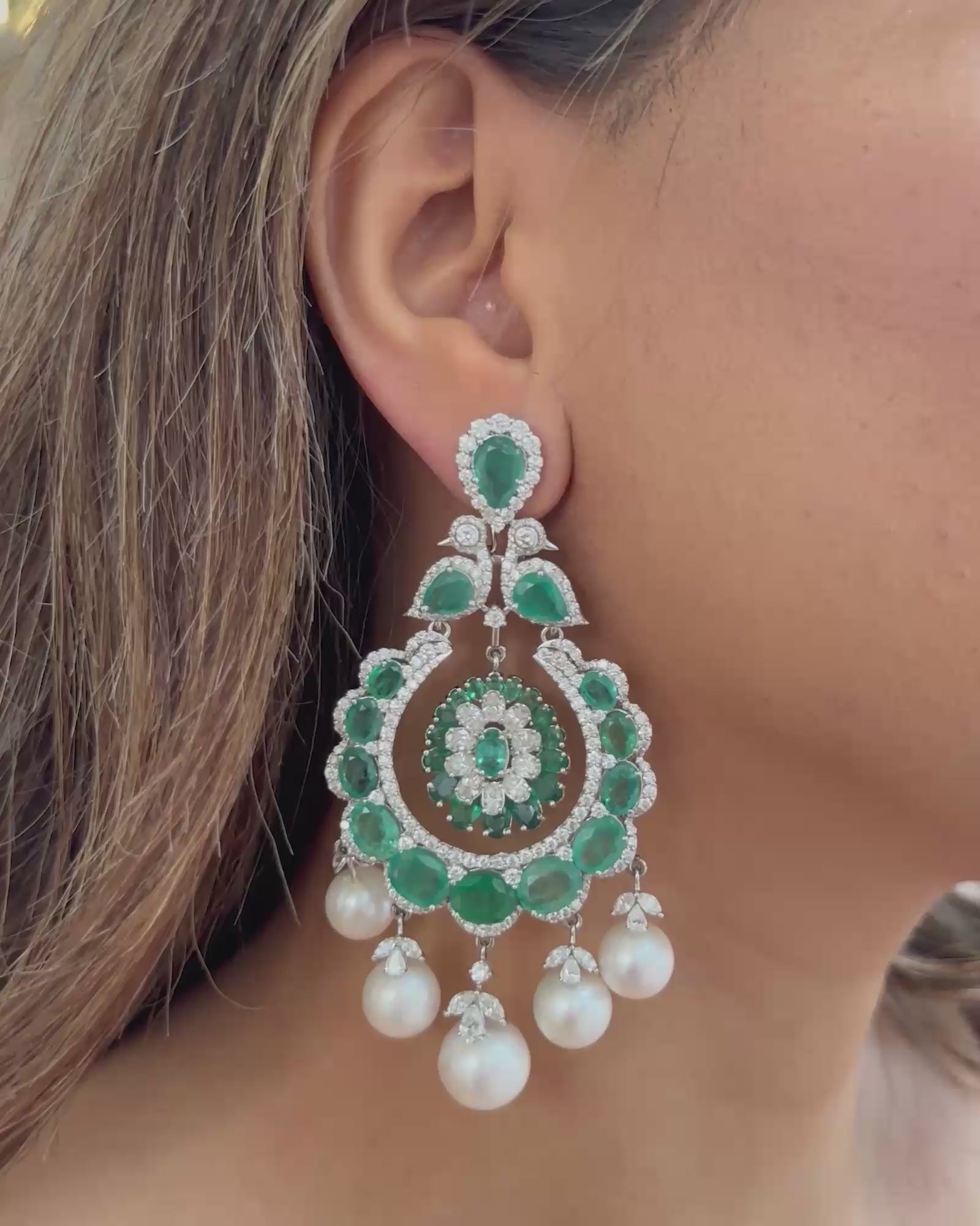 Zambian emeralds of striking depth, framed with over 13 carrats of marquee, pear, oval and round diamonds and finished with elegant pearl drops — the Mainstage Emerald Earrings embody heritage luxury at its finest. A statement piece for grand occasions, they carry the grace of tradition with the quiet confidence of legacy style. Pair this with black outfits and nude lips, and let these earrings make the grand entrance!