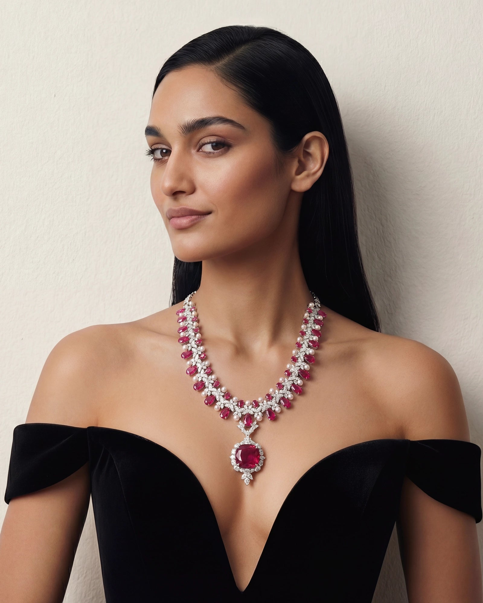 Commanding yet graceful — introducing the Ruby Eclipse Necklace, crafted to make every entrance unforgettable. Dramatically featuring over 92 carats of vivid rubies, framed by 18 carats of diamonds in pear, round, oval and baguette cuts, the necklace is finished with freshwater pearls that lend it a soft, luminous edge. Pair it with your favourite gown or festive fits for an effortlessly striking look.