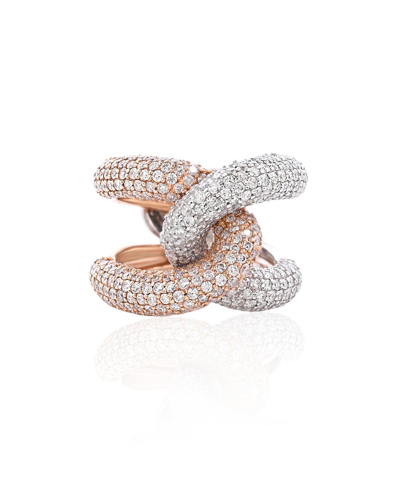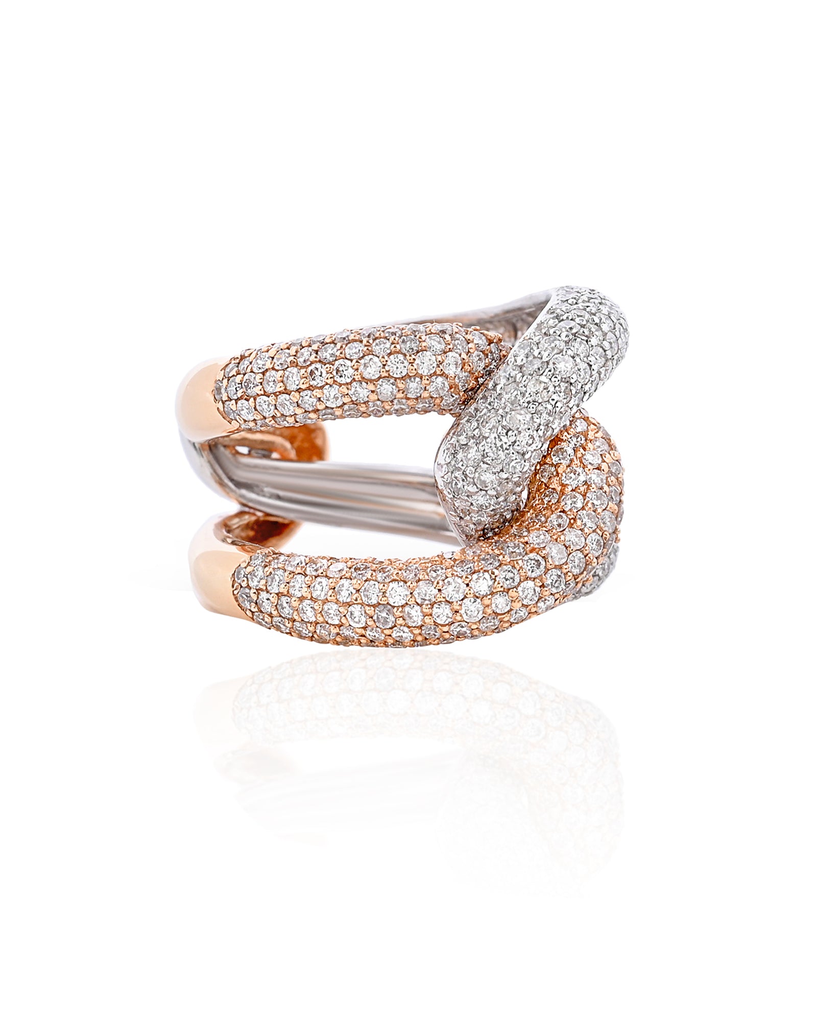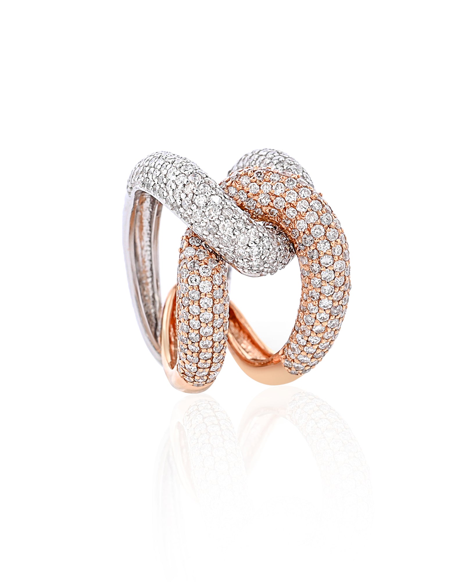 For the summer of 2022 our memo is clear - rings are the ultimate fashion accessory. Our Hooked on Diamonds ring sets the 'More Is More' tone with its organically unified design of a diamond studded knot! And its not all, it’s also a two-tone-affair with its rose gold and white gold finish! So get going for your evening soiree's with this absolute stunner of a ring!