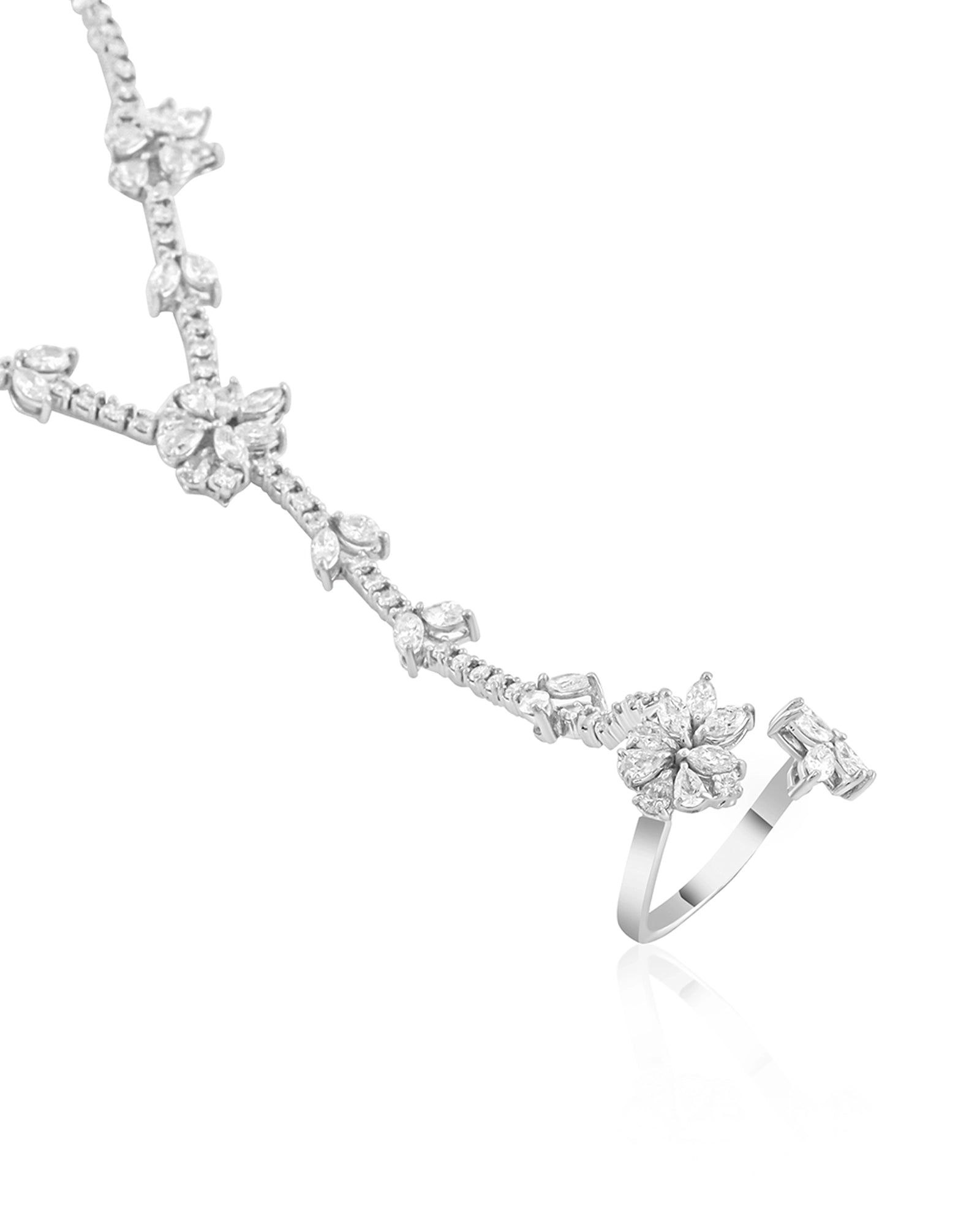 Diamond Bloom is a hand harness that instantly lifts your mood—and your hand game. Crafted with nearly 7 carats of marquise, pear, and round-cut diamonds, it drapes fluidly across the hand and wrist with effortless elegance. Designed for celebrations and statement moments, it pairs seamlessly with both Indian ensembles and red-carpet looks, standing apart through refined design and exceptional craftsmanship.