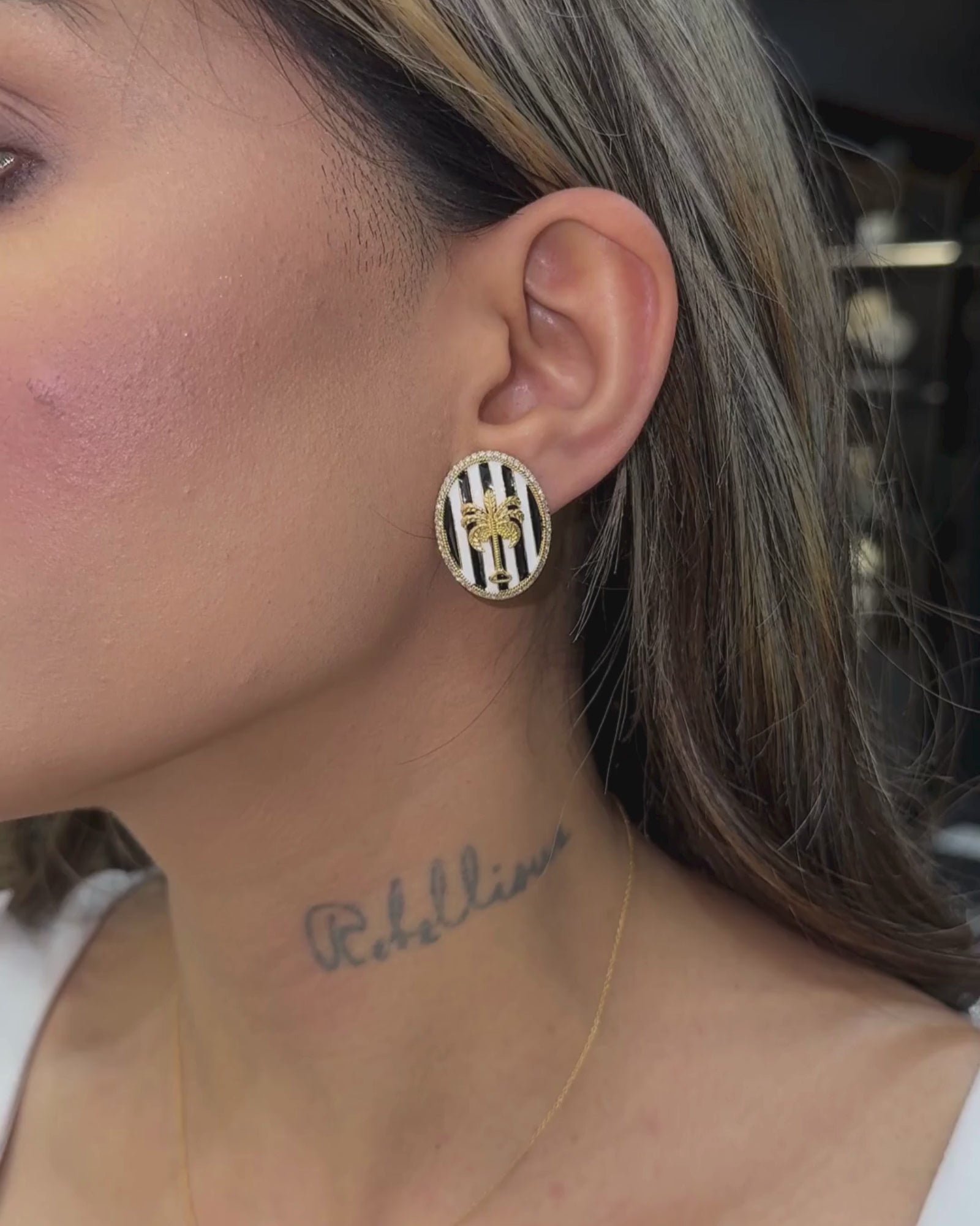 The Palm Crest Studs bring a playful tropical touch to your everyday jewelry lineup. Set with round diamonds and finished with a distinctive gold palm motif, they add just the right pop of character while still feeling easy and wearable. Versatile enough to go from resort wear to daily styling, these studs slip effortlessly into your rotation. Wear them solo for a subtle statement or pair them with the Palm Crest Pendant for a coordinated look.