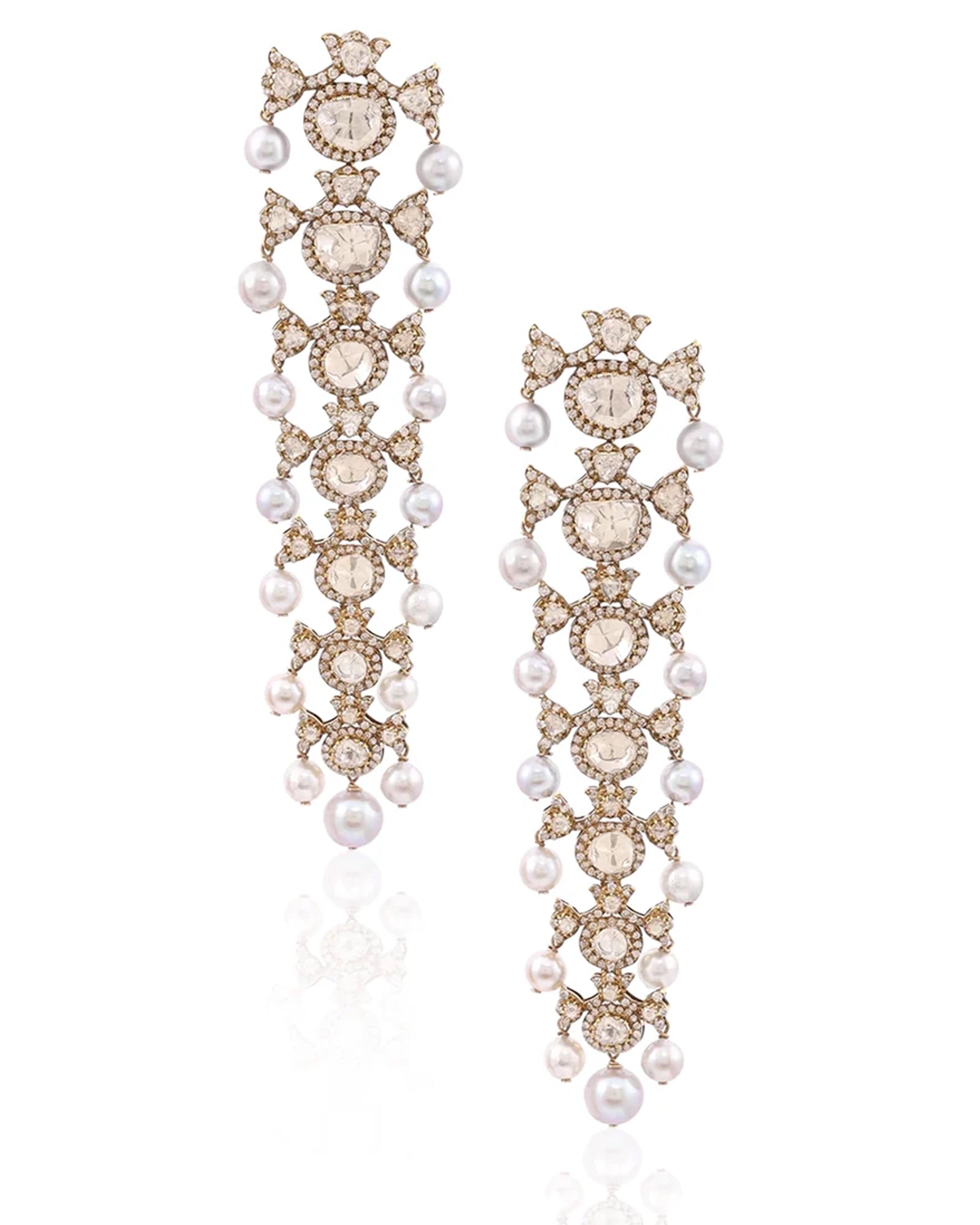 Designed to move with effortless grace, the Raat Rani Polki Earrings feature round and rose-cut diamonds totaling over 4 carats, paired with over 3 carats of polki and finished with 32 carats of luminous freshwater pearls. Easy to dress up or down, they pair beautifully with contemporary silhouettes—bringing softness, shine, and quiet drama to every look.