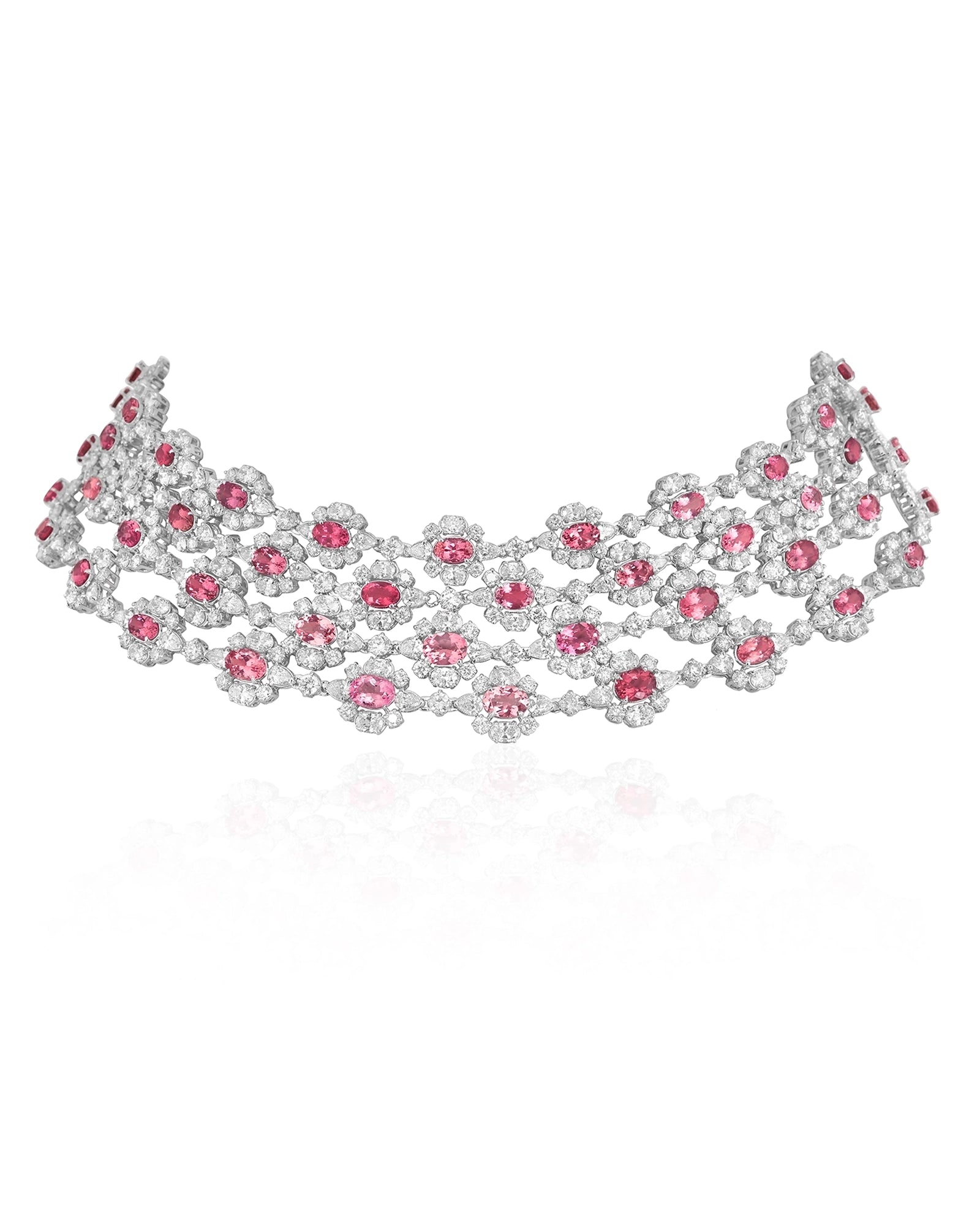 The Aveline Cascade choker is a true showpiece — a multi-tiered necklace that bridges high-jewellery craftsmanship with red-carpet presence. Layering over 20 carats of blush tourmalines with more than 30 carats of round, pear, and oval-cut diamonds, all arranged in interlinked tiers, creating a cascading mesh. Designed for moments where subtlety isn’t the brief, this piece is perfect for grand parties, evening soirees, and galas.