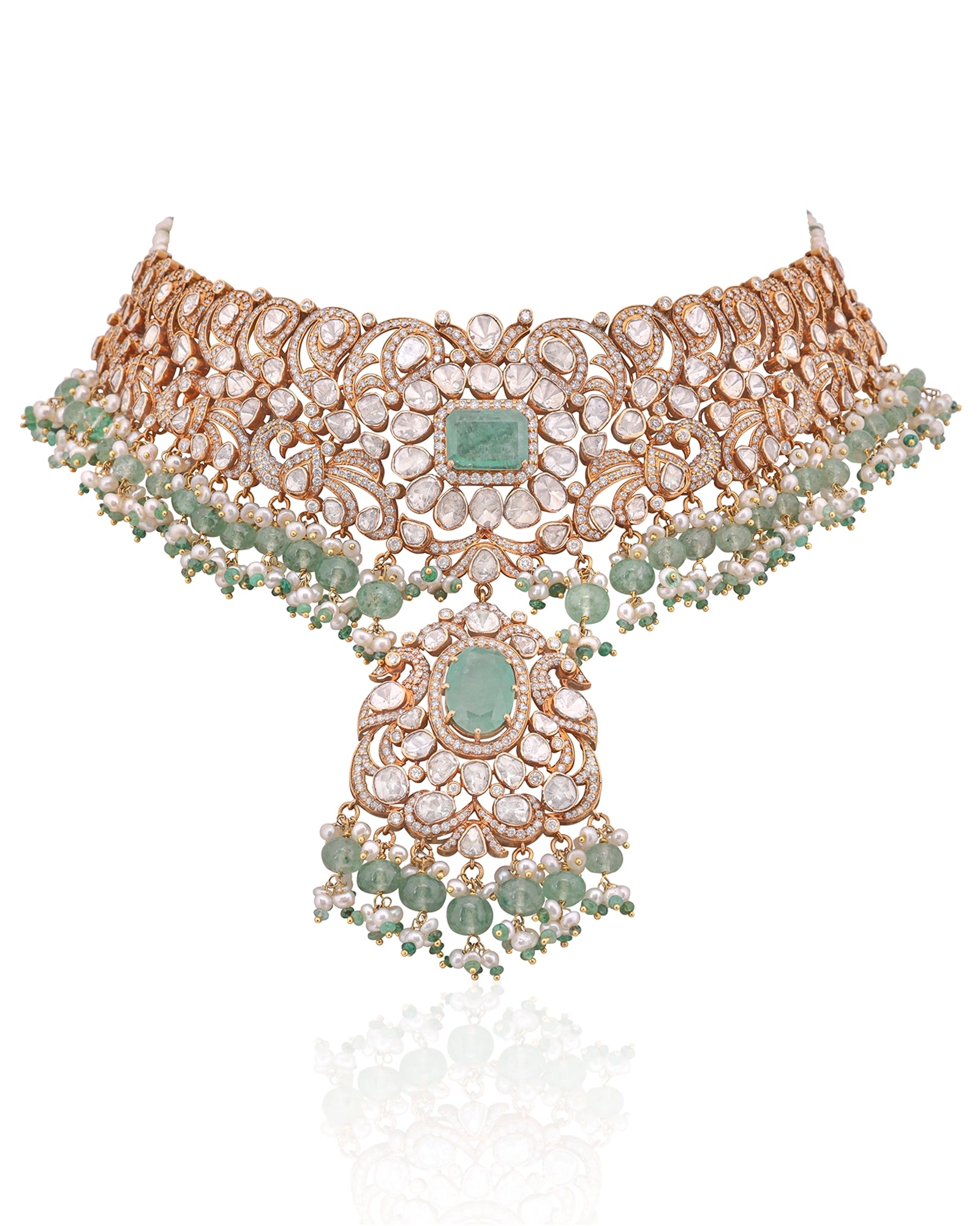 Look like a vision in the Zahra Polki Necklace — the ultimate bridal jewel designed to captivate and amaze. Russian emeralds, fresh water pearls and close to 25 carats of syndicate polki and round diamonds bring colour, light, and movement together in breathtaking harmony. Made for the bride who wants her moment to feel unforgettable, this masterpiece is a jewel that lingers long after the celebration ends.