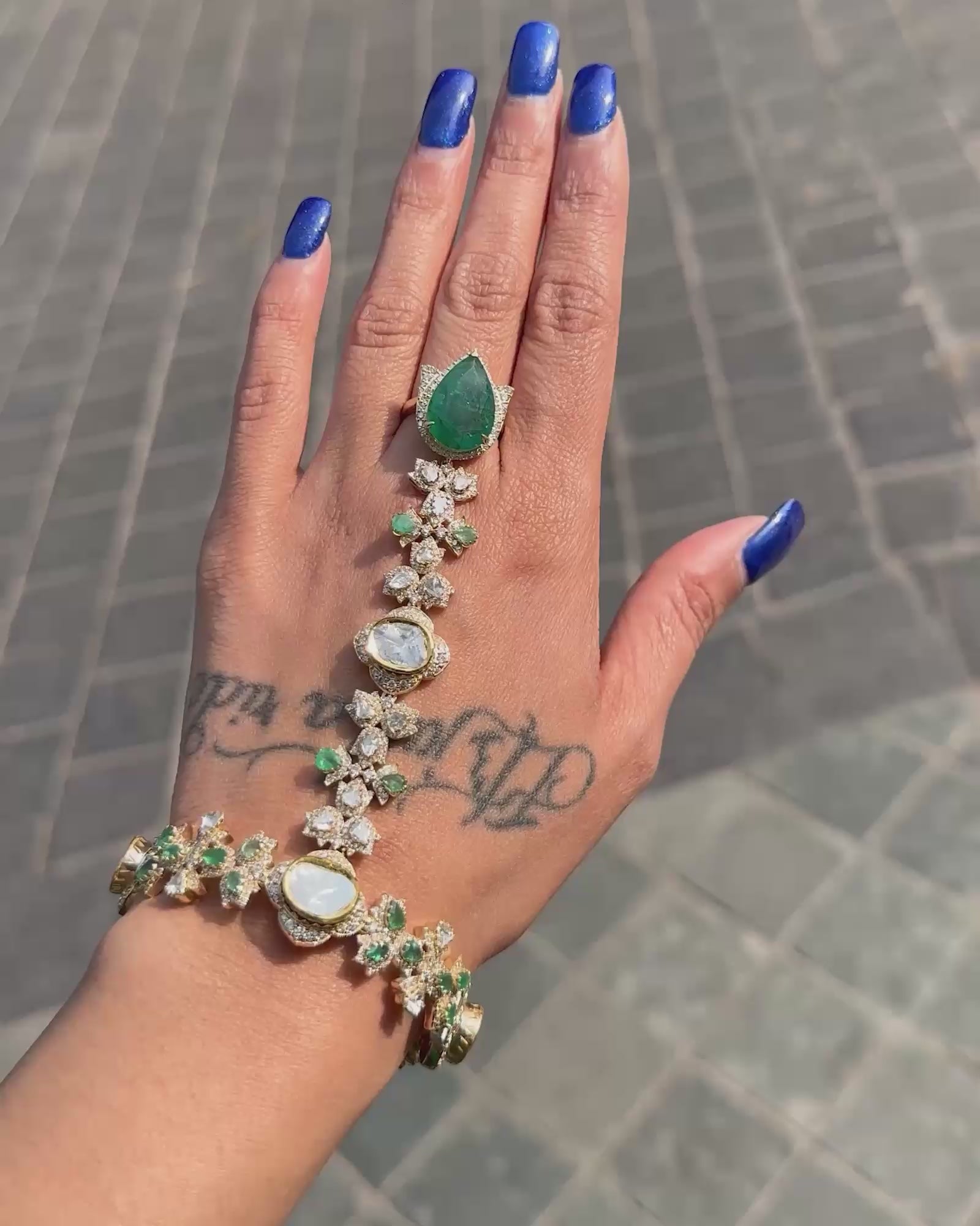A striking expression of tradition reimagined, the Emerald Bagh Haath Phool commands attention with over 13 carats of emeralds, framed by more than 10 carats of round and polki diamonds. Created for weddings and ceremonial moments, this piece completes a look with refinement and unmistakable impact.