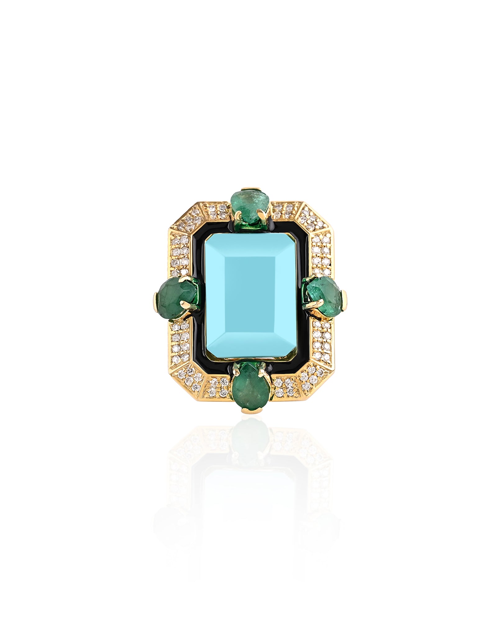 The Blue Lagoon ring is designed to transport you to a sunny beach day. It features a beautiful blue geometric coral in the centre, accented by pear-shaped emeralds and diamonds. The vibrant blue colour with luxe emeralds and diamonds add that perfect touch of bold and luxury to any minimal outfit.