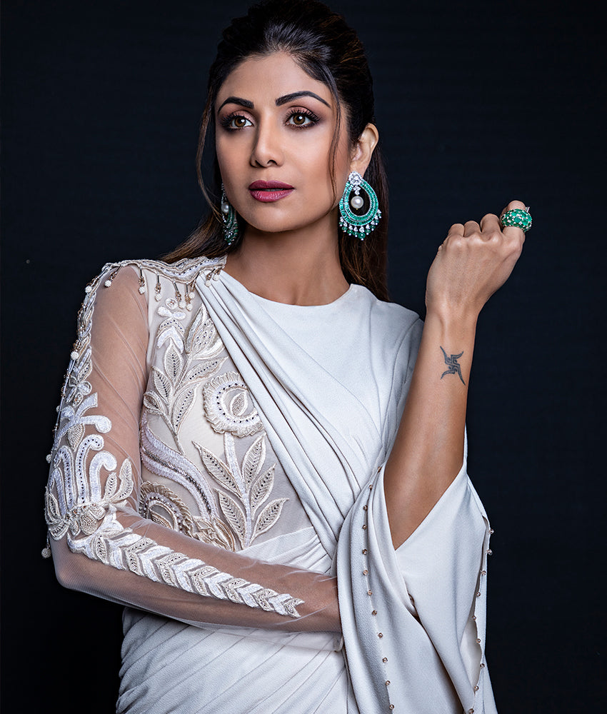 SPOTTED RECENTLY ON SHILPA SHETTY! A showcase of AMARIS' affinity for precious gemstones are the 'IT' Girl earrings. Gorgeously green Zambian Emeralds have been creatively set in a double-row drop shape frame that not only adds glamour but also elevates and accentuates this contemporary design, also highlighted by a gorgeous cluster of Fancy shape diamonds and South Sea Pearls! Designed for women who have a taste for finer things and are not afraid of making a statement through their passion for rare and excpetional jewels.