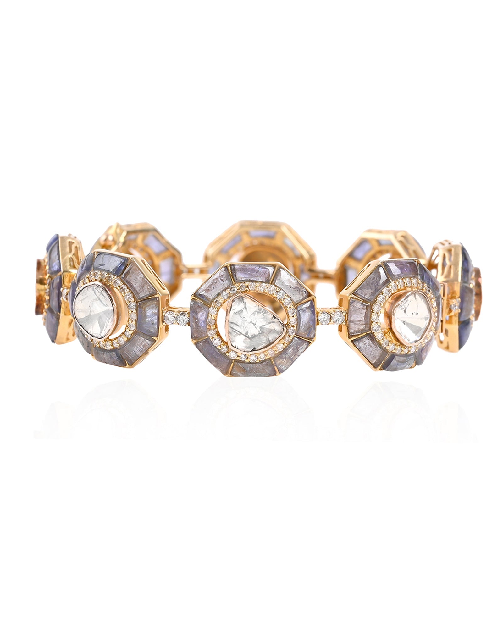 When Geometrics meet traditional aesthetics! Get your hands on our Tanzanite Hour bangle handcrafted with the most gorgeous shade of Tanzanite stones using the AMARIS heritage technique of 'Uttrai' work and polki set in a geometric frame of gold. Wear it solo or buy as a pair, this gorgeous bangle will add the perfect touch of off-beat modernism to your festive wardrobe.Price is for a single bangle (one piece). If you'd like a pair (two bangles), please add two to your cart
